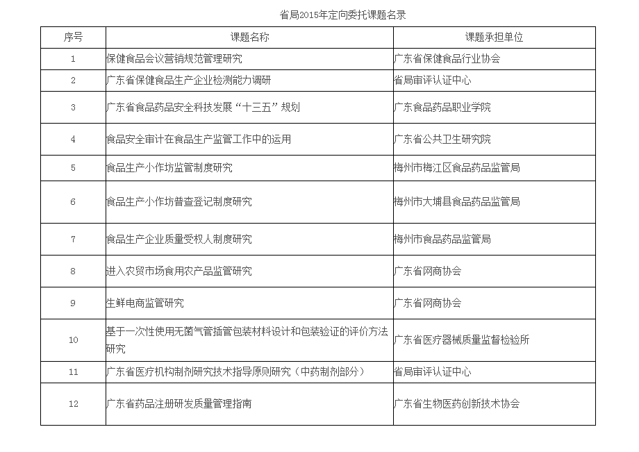 為通過科技創(chuàng)新,提高食品藥品監(jiān)管水平,省食品藥品監(jiān)督管理局大力開展科技創(chuàng)新活動,于近日啟動了“食品安全審計在食品生產(chǎn)監(jiān)管工作中的運用”等12個定向委托課題的系列研究,針對目前監(jiān)管工作的熱點、難點問題,著眼于食品藥品監(jiān)管理論、機制和監(jiān)管手段的研究,將為全省食品藥品監(jiān)管工作提供指引。 本次研究項目是省局首次以定向委托課題的形式開展的科技創(chuàng)新活動,將過去分散在機關(guān)處室的課題納入省局總體科技工作進行統(tǒng)籌安排,從課題計劃入手,抓年度安排;從課題過程管理入手,抓課題的組織、實施、監(jiān)督及結(jié)題驗收工作;從結(jié)果入手,重點落實績效管理,力爭將最新研究成果應(yīng)用于監(jiān)管工作,提高監(jiān)管效能。 附:《省局2015年定向委托課題名錄》