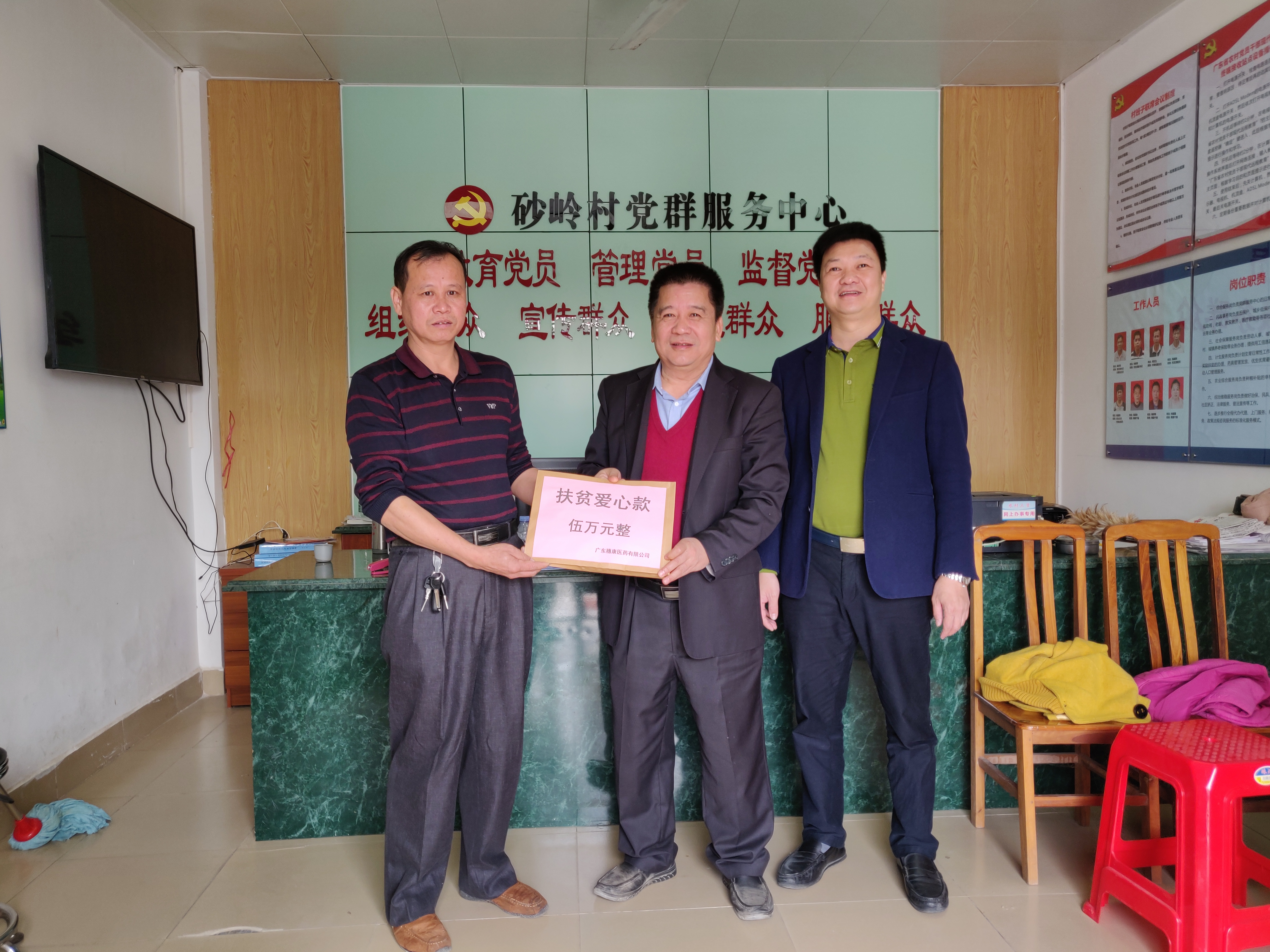 受穗康醫(yī)藥有限公司黃寶壬董事長委托,公司鐘穗金、李永健兩位領(lǐng)導(dǎo)前往觀音閣砂嶺村委會,代表黃董與穗康全體員工給村民送去慰問金5萬元。